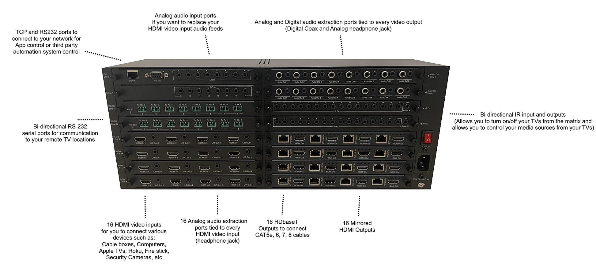 - 16 HDMI Inputs, 16 HDbaseT Outputs, 16 MIRRORED HDMI Outputs, 16 HDbaseT Receivers (PoC 230ft distance), 16 digital coax outputs that mimic the outputs, 16 analog 3.5mm outputs that mimic the outputs, 16 analog 3.5mm outputs that mimic the inputs, Bi-directional IR, Bi-directional RS232