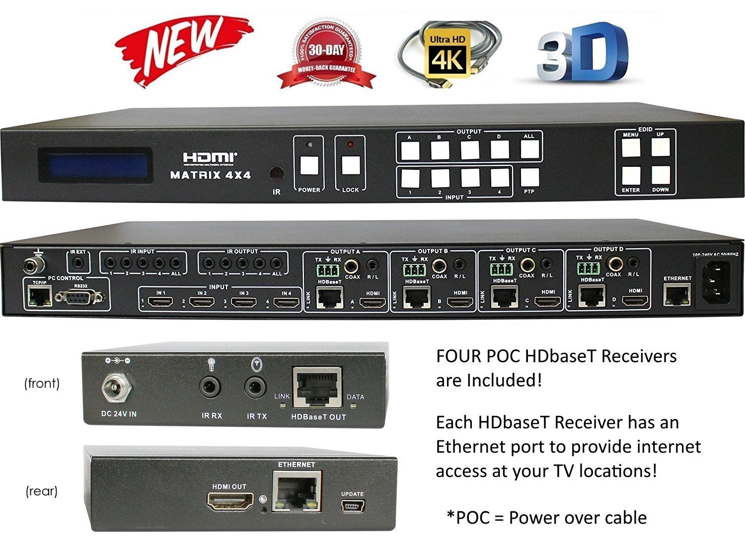 4x8 4x4 HDBT 4K HDMI Matrix SWITCHER w/ Four ETHERNET PoC RECEIVERS (CAT5e or CAT6). HDCP2.2 HDTV Routing 100M SELECTOR SPDIF Audio CONTROL4 Savant Home Automation Internet